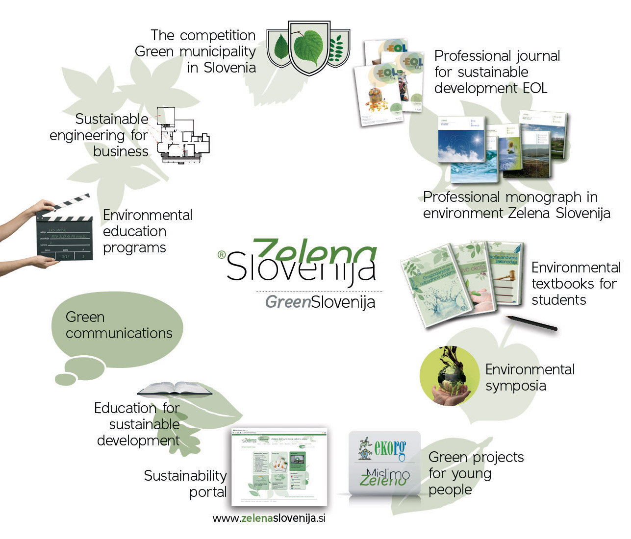 | Description | Diagram of Green Slovenija program, vision of sustainable and green development of Slovenija, Fit media Ltd activity, which connects a wide diapason of communication, research and development projects |