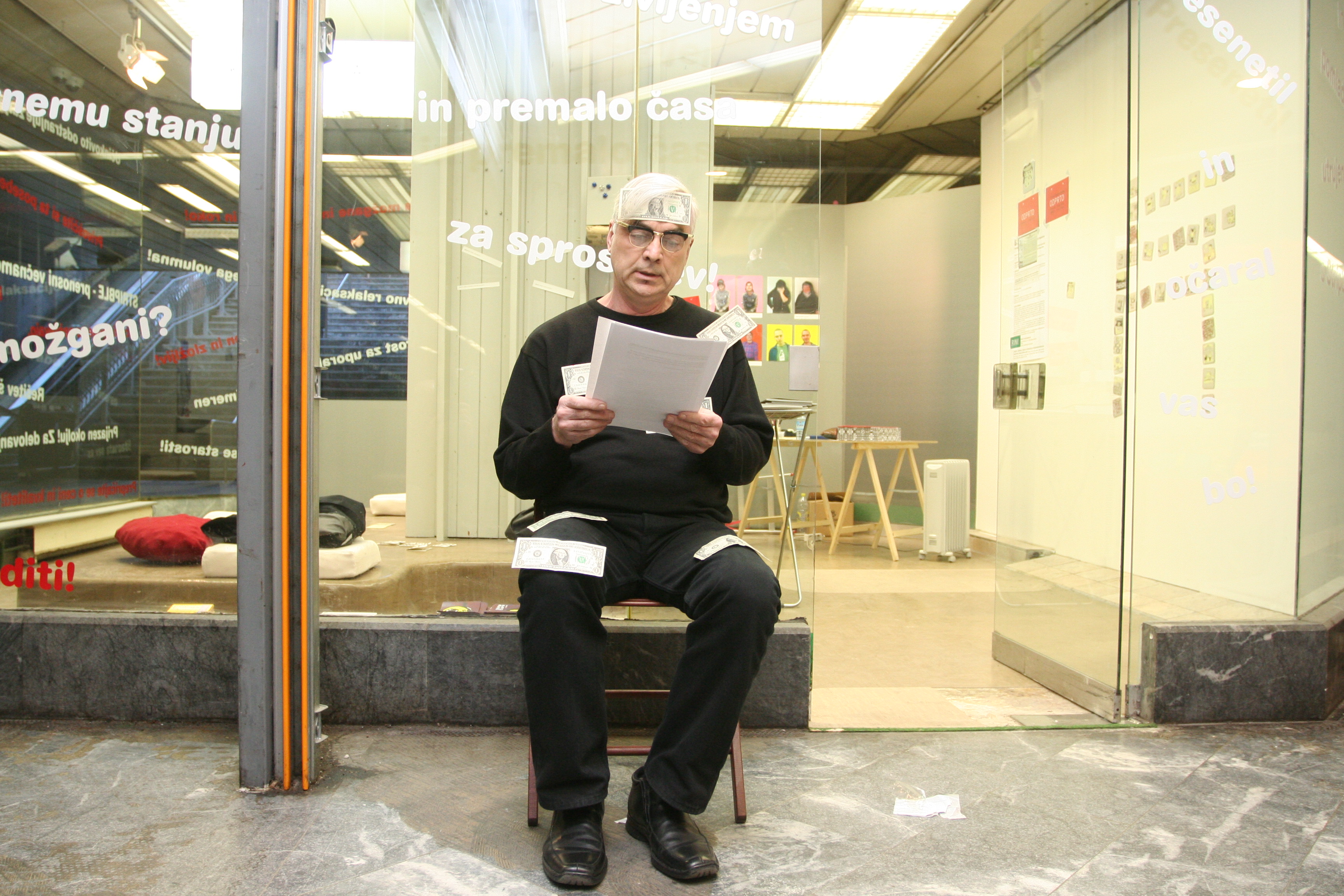 | Description | Balint Szombathy, a conceptual artist from Vojvodina, performing Strogo zaupno ('Strictly confidential') in front of the Kapsula Gallery, 2008 |