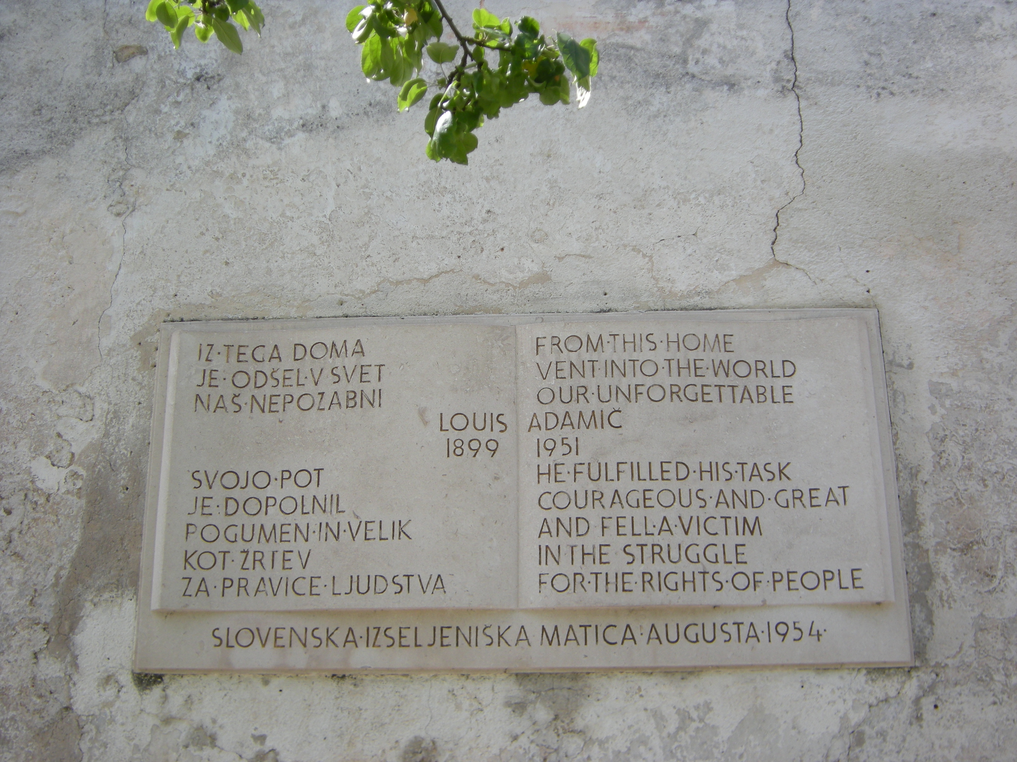 | Description | Plaque at the Louis Adamič Memorial Room commemorating Adamič [1899-1951]a noted Slovenian author journalist and political activist, who became an American citizen in 1918. The most important collection of his work is held by Princeton University |