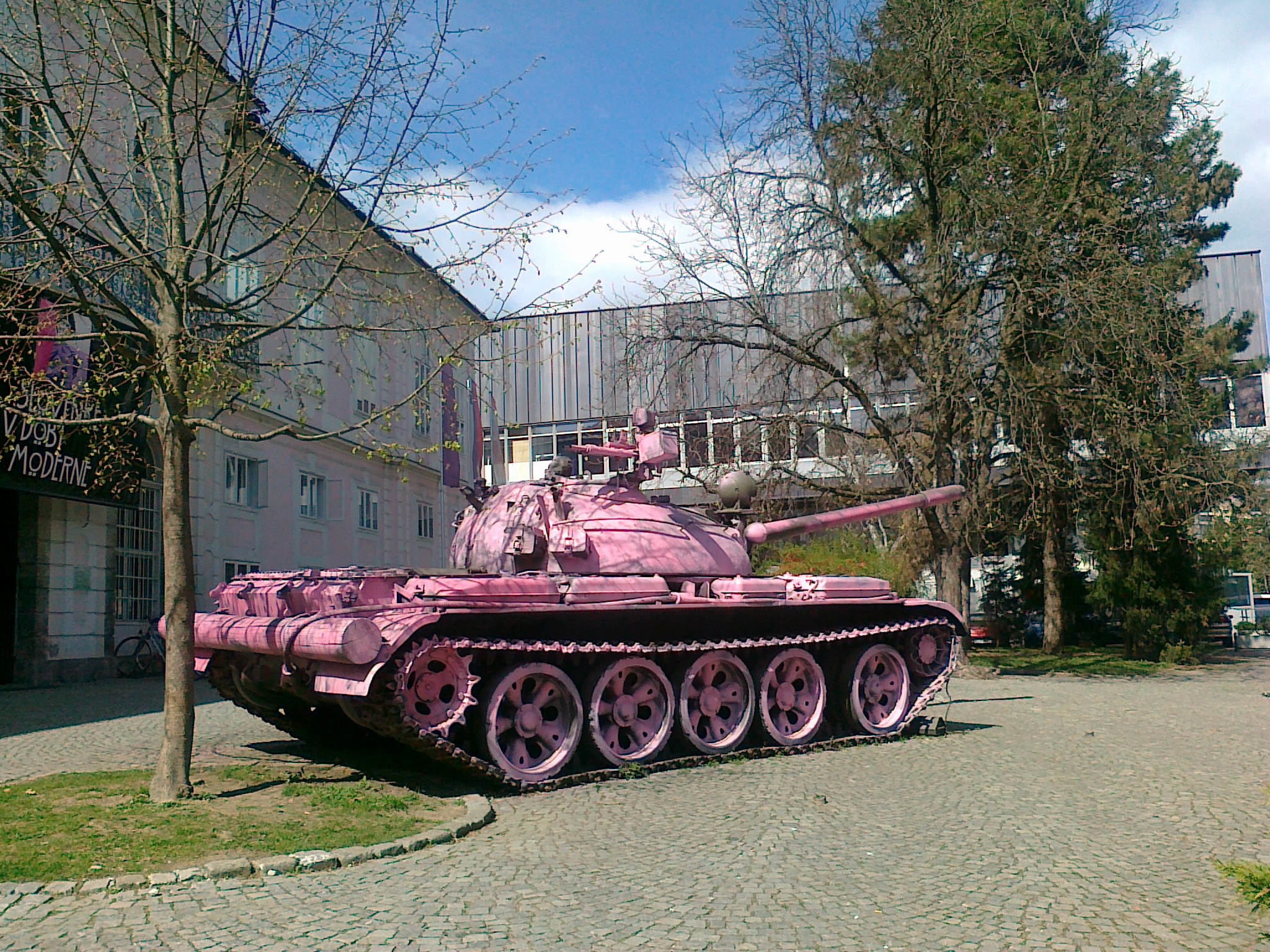 | Description | The tank from the Ten-Day War in Slovenia (1991) in front of the National Museum of Contemporary History. On the eve of the International Women's Day in 2012 it was sprayed pink by the unknown activists and became a new popular landmark in Ljubljana. It is owned by the Military Museum of Slovenian Armed Forces and was transferred to the Park of Military History Pivka only a few months after the action. The pink paint was removed. |