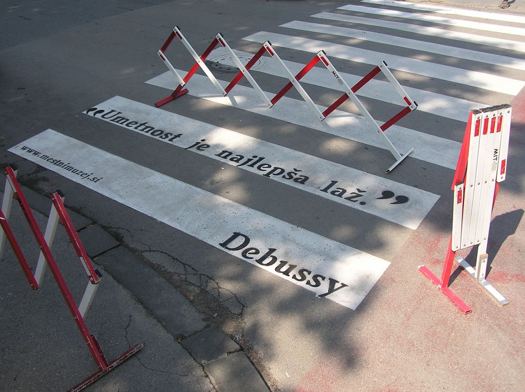 | Description | Art project Street Poetry created for City Museum of Ljubljana by Poper Studio, 2011. The quote by Claude Debussy written on the crosswalk: "Art is the most beautiful deception of all". |