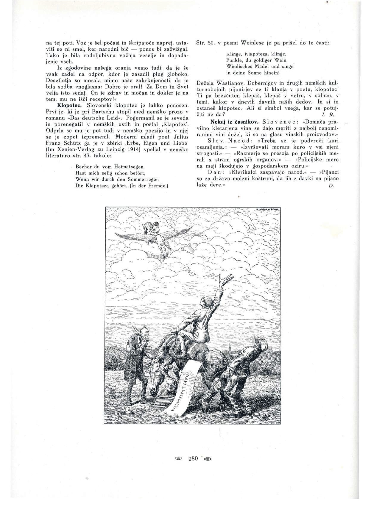 As a young member of the Vienna-based Vesna group in his early career he received artistic and stylistic influences of the Secessionist movement’s linear style of caricatures, together with his Slovene contemporaries Gvidon Birolla and Maksim Gaspari. He got an opportunity to draw for the satiric newspaper Osa [The Wasp], leaning on the caricatures from satiric newspapers as Der wahre Jacob from Stuttgart or Simplicimus from Munich or the Viennese editions of Muskette, Der liebe Augustin, Die Fackel… Later on he developed his own style which was closer to narrative illustration full of personifications and satiric allegories.